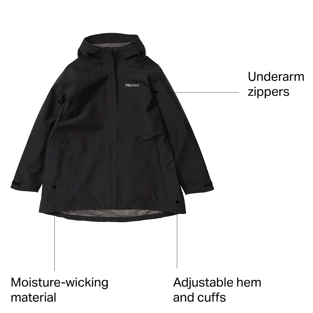 - Adjustable hem and cuffs help keep droplets from creeping in